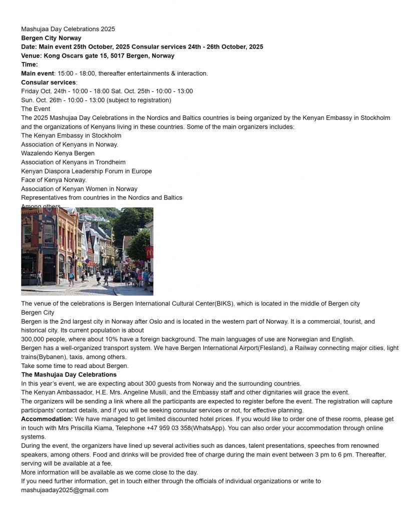 As we continue to mourn the demise of the former Prime Minister of the Republic of Kenya, The Right Honourable Raila Amolo Odinga, E.G.H., I wish to reaffirm that Mashujaa Day Celebrations will go on as scheduled, in Bergen, Norway on 25th October 2025. The Draft programme is attached herein.